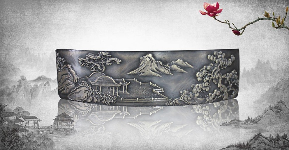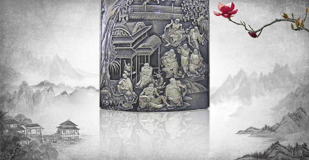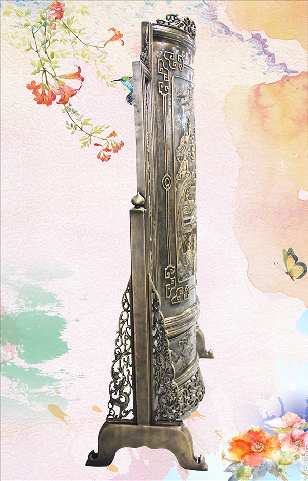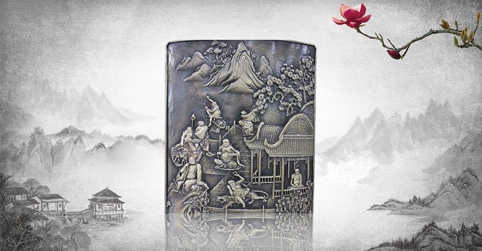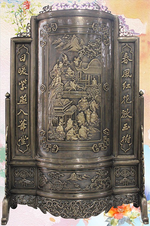 此幅青銅鑄造的《十八羅漢插屏》,是從一友人收藏的大約清中期紅木插屏上翻模制成的。整體上看玲瓏天成,布局精巧。從工藝上看雕法嫻熟,匠心獨具。特別是十八羅漢,個個活靈活現(xiàn)、栩栩如生。作者通過板塊錯落的布局,使畫面生動起來,產生了上乘的視覺效果。